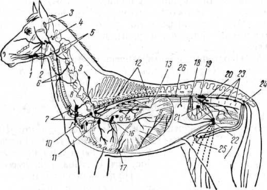 1 — подчелюстной лимфатический узел, 2 — заглоточные медиальные уу., 3— околоушный у., 4 — узел воздухоносного мешка, 5 — шейные глубокие передние уу., 6— шейные глубокие средние уу.. 7 — шейные глубокие задние уу., 8 — поверхностный шейный лимфатический у., 9 — глубокий выйный у., 10 — узел входа в грудную полость, 11 — средостенные передние уу.. 12 — межреберные уу., 13 — средостенные аортальные уу., 14 — средостенные задние уу., 15 — бифуркационные средние уу., 16 — бифуркационные левые уу., 17 — диафраг-мальные уу., 18 — поясничные уу., 19 — внутренние подвздошные, или тазовые уу., 20 — подвздошные средние уу., 21 — подвздошные боковые уу., 22 — глубокие паховые уу., 23 — крестцовые уу., 24 — заднепроходные уу., 25 — поверхностные паховые, или надвыменные, уу., 26 — грудной проток.