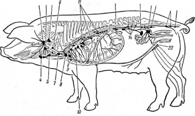 Рис. 8. Глубокие лимфатические узлы свиньи (из Koch. 1965):