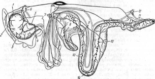 Рис. 12. Лимфатические узлы органов брюшной полости лошади (из Koch, 1965):
