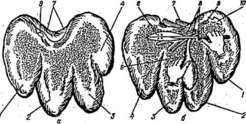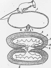 а — момент разреза почек по большой кривизне, б — разрезанная почка с обнаженными зонами: