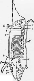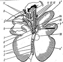 1 - брыжеечные лимфатические узлы, 2 — тощая кишка, 3 — подвздошная кишка, 4 — слепая кишка, 5 — ободочная и двенадцати перстная кишка, 6 — прямая кишка, 7—лимфатические узлы прямой кишки и рубца, 8 — селезенка, 9 — рубец, 10 — сетка, 11— книжка, 12 —сычуг, 13 — поджелудочная железа, 14—лимфатические узлы сычуга, 15 — лимфатические узлы ободочной кишки.