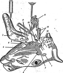 1 — угол челюсти, 2 — подчелюстные (нижнечелюстные) лимфатические узлы, 3 — околоушной лимфатический узел, 4 — большой жевательный мускул (массетер), 5 — околоушная слюнная железа, б — срезанная ушная раковина, 7 — яремные отростки и мыщелки затылочной кости, 8 — латеральный заглоточный лимфатический узел, 9 — подчелюстная слюнная железа (смещена) с языком, 10 —пищевод, гортань, 11 —язык, 12 — глотка, 13 — миндалины, 14 — медиальные заглоточные лимфатические узлы.