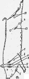 1 — подчелюстной (основная группа, 11 — добавочная группа их, 2 — подчелюстная слюнная железа, 3 — околоушной, 4 — латеральный заглоточный, 5 — поверхностные шейные (дорсальная группа), 51 — поверхностные шейные (вентральная группа), 6 ~ краниальный грудной, 61 — подмышечный первого ребра (под ребром), 7 — ножки диафрагмы, 71 —дорсальные средоствнные, 8 — поясничный, 9 — медиальный подвздошный, 10 — латеральный подвздошный, 11 — наружный подвздошный, 12 — тазовый,13 — надколенный, 14 — подколенный, 15 —поверхностный лаховый, Линии: а — перпендикуляр от переднего контура ушной раковины, б — то же от заднего контура ушной раковины, в — косая линия от затылка к плечевому суставу, г — соединяющая маклок с коленной чашкой, д — от седалищного бугра к пяточному.