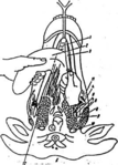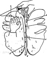 Рис. 18. Методика осмотра сердца на столе (момент вскрытия желудочков по большой кривизне)