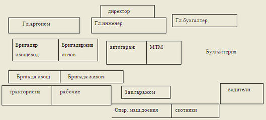 Таким образом, директору непосредственно подчиняются гл. агроном, гл. инженер, гл. бухгалтер ; бригадиры(2 чел) гл. агроному. Производственная бригада- подразделение, коллектив которого, имея в своем распоряжении средства производства, на основе разделения и кооперации труда выполняет комплекс работ по производству продукции или его обслуживанию и несет ответственность за конечные результаты. Отраслевые бригады объединяют работников(10 чел), занятых производством однородных по технологии видов продукции в составе какой-нибудь отрасли хозяйства (овощеводство). В них наиболее полно осуществляется принцип разделения и кооперации труда, растут материальная заинтересованность и ответственность за конечные результаты. Трактористы (8 чел) и рабочие тесно привязаны с бригадой овощеводов. Гл. инженеру(1 чел) подчиняется авто- гараж , и машинотракторная мастерская, зав. гаражом (1 чел); водители(7 ч); гл. бухгалтер в ее подчинении находятся 4 чел. Также набираются рабочие на сезонную работу, в основном временные их число зависит от необходимого участка работы.