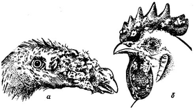 Рис. 21. Голова индюка (а) и петуха (б) при оспе