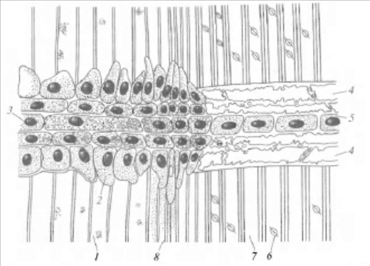 1 — ситовидная клетка; 2 — стоячая паренхимная клетка лубяного луча; 3 — лежачая паренхимная клетка сердцевинного луча; 4 — горизонтальные трахеиды; 5 — паренхимная клетка сердцевинного луча; 6 — окаймленная пора; 7 — трахеида; 8 — камбий.