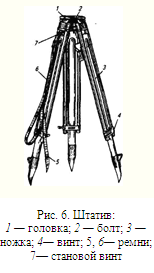 Для установки теодолита над точкой местности — вершиной измеряемого угла служит штатив (рис. 6).