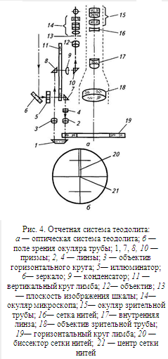 Оптическая схема теодолита показана на рисунке 4, а. От зеркала 6 через иллюминатор 5 свет падает на вертикальный 11 и горизонтальный 19 крути лимба. Изображение штрихов вертикального лимба с помощью призмы 7 и линз 2, 4 объектива передается в плоскость штрихов горизонтального лимба с помощью линзы 17, объектива горизонтального крута 3, призмы 8 на конденсатор 9, на котором нанесен индекс для отсчитывания. Совместное изображение индекса и штрихов деления лимбов передается посредством призмы 10 и объектива 12 на плоскость изображения шкалы 13, которое через окуляр 14 наблюдается в поле зрения микроскопа. На рисунке 3.78, б в поле зрения микроскопа видны штрихи деления горизонтального Г и вертикального В кругов (см. рис. 3).