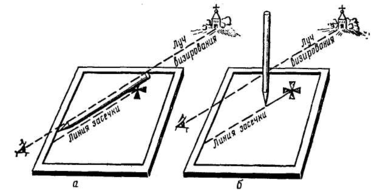 Кроме того, визирование можно выполнять по карандашу, расположенному вертикально (рис. 3, б). Карту ориентируют и поднимают на высоту плеч. Карандаш ставят отвесно на условный знак ориентира и через него визируют на предмет. Затем, не изменяя положения глаза и карты, медленно передвигают карандаш на себя — он прочертит направление от предмета к точке стояния.