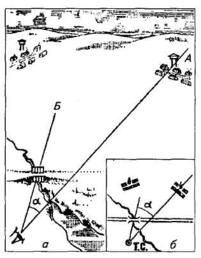 Рис. 4. Опознание дальнего местного объекта на карте: а — местность; б— карта го знака, прочерчивают линию от ориентира на себя.