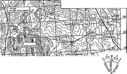 Измерение углов и направлений по топографической карте. Истинный азимут А, магнитный азимут АM и дирекционный угол α данной линии можно измерить на карте с помощью транспортира. Для удобства измерения этих величин на отечественных топографических картах под нижней рамкой листа слева от линейного масштаба помещают график, показывающий взаимное расположение географического, магнитного меридианов и вертикальных линий сетки, а также указывают с точностью до минуты среднее склонение магнитной стрелки, гауссово сближение меридианов и годовое изменение магнитного склонения.