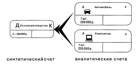По способу группировки и обобщения информации счета подразделяются на синтетические и аналитические. Синтетические счета дают обобщенную характеристику объекту учета. Аналитические счета раскрывают и детализируют содержание синтетического счета. Синтетические счета предназначены для учета информации о составе и движении хозяйственных средств предприятия, источниках и хозяйственных процессах в обобщенном виде и в денежном измерителе. Учет на аналитических счетах ведут и в денежных, и в натуральных измерителях (счета учета товарно-материальных ценностей). Например, объекты основных средств учитывают по количеству и стоимости, готовую продукцию — по массе (или количеству) и стоимости.