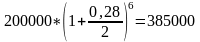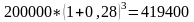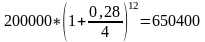 Определите сумму депозитного вклада под 28% годовых в размере 200000 руб. через 3 года при годовом, полугодовом, поквартальном начислении процентов.