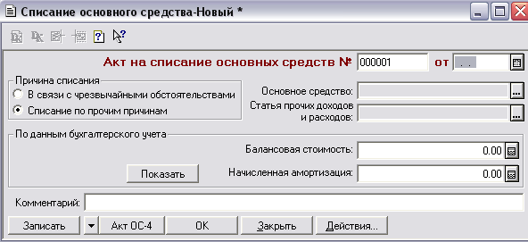 При выбытии основного средства в связи с моральным и физическим износом, а также при ликвидации в связи с чрезвычайной ситуацией следует использовать документ «Списание ОС» (рисунок 9). Документ позволяет оформить акт на списание по форме ОС-4 и отразить данную хозяйственную операцию в бухгалтерском учете.