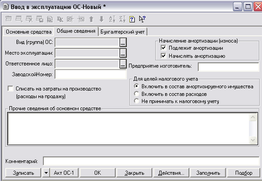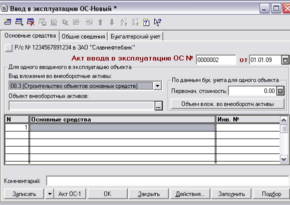 Далее в реквизите «Основное средство» нужно выбрать объект, вводимый в эксплуатацию. Если сведения об основном средстве в справочнике отсутствуют, то следует открыть форму ввода нового элемента (пункт «Новый» в меню «Действие») и ввести наименование объекта, а затем выбрать этот объект в справочнике.