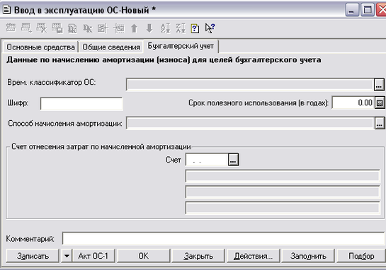 Серые поля обязательные для заполнения (выбрать вид ОС по классификатору, установить срок полезного использования, способ начисления амортизации, счет отнесения затрат по начисленной амортизации).