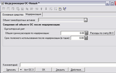 На закладке данного документа «Модернизация» (рисунок 8) заполняется «объект внеоборотных активов», сумма расходов по модернизации и срок полезного использования основного средства после модернизации. Используя кнопку «Расходы по счету 08.3» можно автоматически определить сумму расходов по модернизации, которая увеличит первоначальную стоимость основного средства.