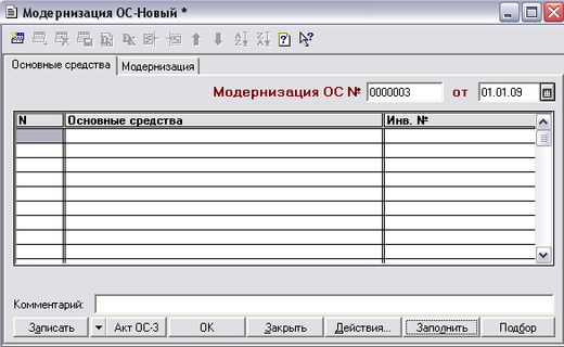В данном документе заполняется вид основного средства, подлежащего модернизации, и устанавливается дата документа. Инвентарный номер выбирается автоматически после выбора основного средства.