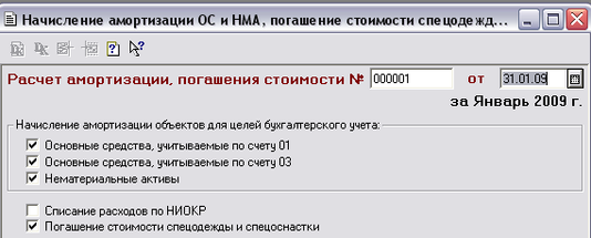 Начисление износа выполняется для тех основных средств, для которых в справочнике «Основные средства» установлен флажок «Начислять амортизацию».