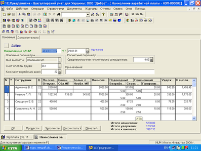 Перейдемо до заповнення табличної частини. Її можна заповнювати рядок за рядком (клавішею Insert), але краще скористатися кнопкою «Заповнити». У табличну частину буде перенесений список співробітників. Графа «Дн.» таблиці заповниться значенням реквізиту «Кількість робочих днів» з шапки документа, а графа «По окладу» — значеннями реквізиту «Оклад» з довідника «Співробітники». Якщо тепер в осередок «Дн.» ввести кількість реально відпрацьованих днів, нарахована співробітникові зарплата буде перерахована (рис. 6.2).
