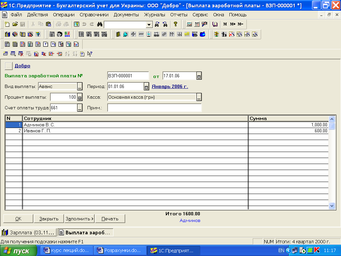 Заповнена екранна форма документа «Нарахування ЗП» в режимі нарахування авансу показана на рис. 4.1. У цьому режимі документ не формує бухгалтерських проводок, оскільки видача суми авансу з каси підприємства реєструється витратним касовим ордером або платіжною відомістю. Режим «Аванс» використовується для отримання друкарської форми платіжної відомості. Крім того, якщо при подальшому нарахуванні основної зарплати сформувати розрахунково-платіжну відомість, в ній буде автоматично врахована сума виплаченого раніше авансу.