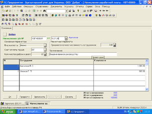 Нарахування заробітної плати, розрахунок утримань із співробітників і суми зборів, що обчислюються від фонду оплати праці, проводиться документом «Нарахування ЗП», реквізит «Вид виплати» якого встановлений в значення «Основна з/н». Заповнення цього документа високо автоматизоване.