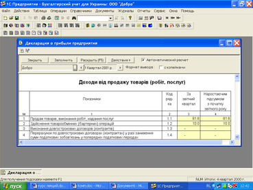 У більшості звітів використані однакові кнопки управління їх побудовою. Розглянемо складання звітів на прикладі Декларації по податку на прибуток підприємства. Це, мабуть, один з найскладніших звітів – "Декларація по податку на прибуток" (рис. 4.1).