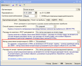 На закладке Налог на прибыль добавлен реквизит Метод начисления амортизации (с 2009 г.), в котором хранится применяемый организацией метод начисления амортизации. Этот реквизит подлежит обязательному заполнению! (см. рис. 1).
