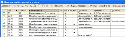 Учет затрат, формирующих первоначальную стоимость объектов основных средств, в программе ведется на счете 08 «Вложения во внеоборотные активы» с использование субсчетов 08.01 «Приобретение земельных участков», 08.02 «Приобретение объектов природоиспользования», 08.03 «Строительство объектов основных средств» и 08.04 «Приобретение отдельных объектов основных средств» Рис.10