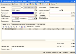 В списке документов «Поступление доп.расходов» (меню «Основная деятельность»-пункт «Покупка» - подпункт «Поступление доп. Расходов») клавишей Ins открываем форму нового документа. Рис.22