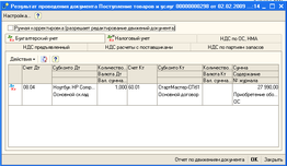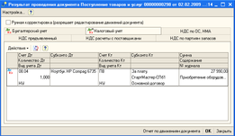 По каждой строке табличной части закладки “Оборудование” при проведении сформированы две бухгалтерские проводки: одна в дебет 07 (Оборудование) - на стоимость покупки без налога, вторая - в дебет счета 19.01 ”Налог на добавленную стоимость при приобретении основного средства” - на суму предъявленного к оплате НДС, в корреспонденции по счету 60.01 “Расчеты с поставщиками и подрядчиками”. Это те счета, которые были указаны в форме документа на закладках “Оборудование” (счета дебета проводки) и “Счета учета расчетов” счет кредита проводки).