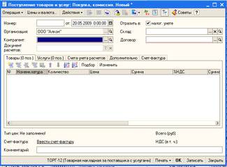 После заполнения формы записываем и проводим документ, вводим документ с реквизитами счета-фактуры поставщика, который тоже проводим.