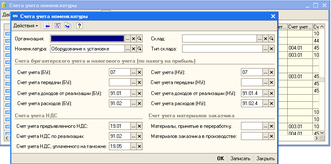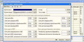 В регистре сведений "Счета учета номенклатуры" задается список счетов учета номенклатуры (товаров, материалов, продукции, услуг и т.д.), подставляемых по умолчанию в документы конфигурации. Каждая запись регистра содержит сведения о счетах бухгалтерского и налогового учета материально – производственных запасов, используемых в различных хозяйственных операциях: при поступлении, реализации, передаче МПЗ и т.д.