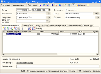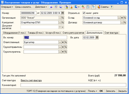 Открываем документ, проводим его, после чего в поле “Ввести счет-фактуру” открываем и заполняем форму нового документа “Счет-фактура полученный”, где указываем реквизиты счета-фактуры поставщика оборудования. Этот документ тоже проводим.