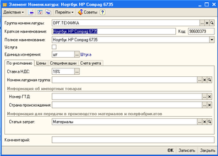 Кроме того, в регистре автоматически создается одна запись, которая не привязана ни к одной группе номенклатуры. Эта запись будет использоваться для автоматической подстановки счетов учета номенклатуры в документы в случае, если пользователь создаст в справочнике "Номенклатура" новые группы, но не создаст для них записи в регистре счетов учета номенклатуры. Настройки этой записи соответствуют группе номенклатуры "Товары".