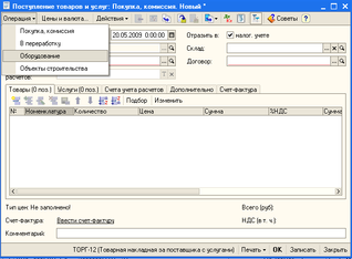 Для отражения в программе операций поступления в организацию ОС, как требующих, так и не требующих монтажа предназначен универсальный документ «Поступление товаров и услуг».
