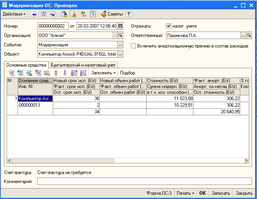 На закладке “Основные средства” выбором из одноименного справочника указывается объект, первоначальная стоимость которого подлежит изменению, и приводятся данные, которые необходимы для изменения параметров амортизации: фактический срок использования, оставшийся срок использования, новый срок полезного использования и т.д.