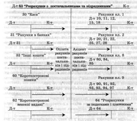 Облік розрахунків з постачальниками за отримані від них матеріальні цінності та іншими організаціями за надані послуги (транспортно-експедиторські, страхування тощо) здійснюють на рахунках: 63 "Розрахунки з постачальниками та підрядниками", 62 "Короткострокові векселі видані" та ін. Одночасно з придбанням матеріальних цінностей відображають суму сплачених податків (податок на додану вартість, акцизний збір тощо) на рахунку 64 "Розрахунки за податками й платежами". Оплату розрахунково-платіжних документів постачальників відображають на рахунках: 30 "Каса", 31 "Рахунки в банках", 33 "Інші кошти", 60 "Короткострокові позики" та ін.