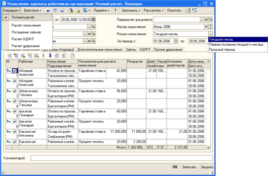 После ввода в информационную базу сведений о текущей выработке работников, об отклонениях от графика работы (в том числе почасовых невыходов), о разовых начислениях и удержаниях можно произвести собственно расчет заработной платы и связанных с ней начислений.