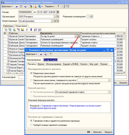 Основные начисления – это начисления, характеризующиеся продолжительностью во времени, т.е. имеющие период действия (оплата по тарифным ставкам, оплата периодов отсутствия работника и пр.).