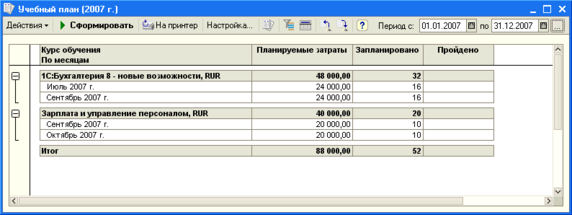 Сводные данные по планам обучения, а также затратам на учебные курсы, их результативности можно получить с помощью отчетов конфигурации (Рис. 23).