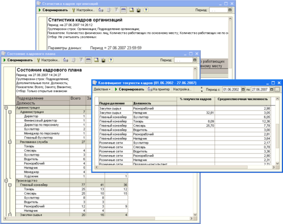 Конфигурация содержит отчеты, позволяющие оценить эффективность кадровой работ (Рис. 15).