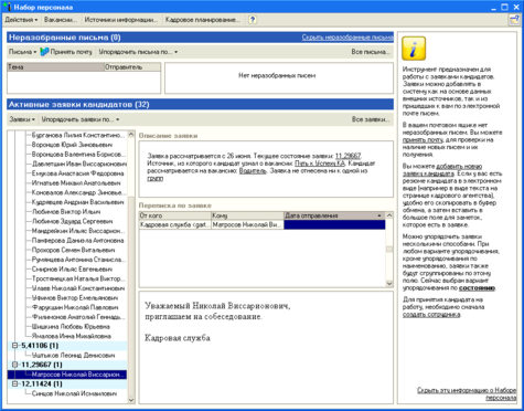 Инструмент предназначен для работы с заявками кандидатов, которые можно регистрировать в системе, как на основе данных внешних источников, так и из пришедших по электронной почте писем. Кроме того, инструмент позволяет:
