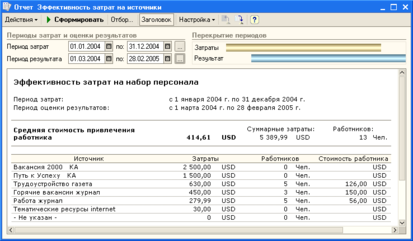 Эффективность работы по обеспечению бизнеса кадрами также подлежит оценке руководителем предприятия. Затраты на привлечение персонала можно проанализировать с помощью соответствующего отчета (Рис. 19).