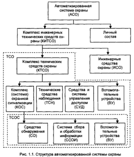 В общем случае в состав комплекса технических средств обеспечения безопасности объекта входят: технические средства охранной сигнализации; технические средства наблюдения; система контроля доступа, в литературе применяются также понятия-синонимы — система управления доступом и система контроля и управления доступом; технические средства пожарной сигнализации; технические средства обнаружения диверсионно-террористических средств и технические средства обнаружения утечки информации. В состав ТСОС входят: средства обнаружения; система сбора, обработки, отображения и документирования информации; вспомогательные устройства - системы электропитания, охранного освещения, оповещения и т.д.