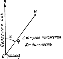 Понятие о системе плоских полярных координат. Если вместо двух взаимно-перпендикулярных осей Х и Y, применяемых в системе прямоугольных координат, взять одну ось Х и начальную точку О на ней, то получим систему полярных координат, которая широко применяется в войсковой практике при целеуказании и ориентировании на местности. В этой системе (рис. 7) ось ON, соответствующая оси Х в прямоугольных координатах, называется полярной осью, а исходная точка О на ней— полюсом.