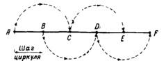 Измерение длинных линий, не умещающихся на линейном масштабе карты, производится по частям. Для этого берут по масштабу раствор циркуля, соответствующий какому-нибудь целому числу километров или метров, и таким «шагом» проходят по карте определяемое протяжение, ведя счет перестановок ножек. Наиболее рациональный порядок перестановки ножек показан на рис. 3, где AF—измеряемая линия, А, В и т. д.—места постановки ножек. Стрелками показано направление перемещения ножек.