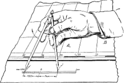 Циркуль при измерениях по масштабу следует держать правой рукой, наклоняя его несколько от себя, так, чтобы хорошо было видно одновременно оба острия ножек. Необходимый раствор циркуля устанавливается легким нажимом среднего или указательного пальца на левую ножку (на рис. 2 показано стрелками).