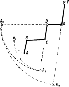 Для измерения извилистой линии шаг циркуля берется меньше (например, 0,5 см или 1 см), сообразно длине звеньев линии. Но более удобно измерение вести следующим образом (рис. 4). Пусть требуется измерить по карте расстояние по линии ABCDEF. Установив раствор циркуля по первому звену линии, т. е. по АВ, переставляем заднюю ножку в точку А1 (на продолжении следующего по ходу измерения звена ВС). Оставляя ее теперь на месте, т. е. в точке А1, увеличиваем раствор циркуля перемещением передней его ножки в точку С. Затем, не изменяя положения передней ножки, заднюю из точки А1 переставляем в точку А2 (на продолжении третьего звена CD). После этого переднюю ножку перемещаем дальше в точку D и т. д., пока не пройдем таким образом всю линию. В итоге получим отрезок A4F, равный искомой длине линии на карте. Остается, не изменяя полученного раствора циркуля, перенести его на линейный масштаб или миллиметровую линейку и определить расстояние, как было указано выше.